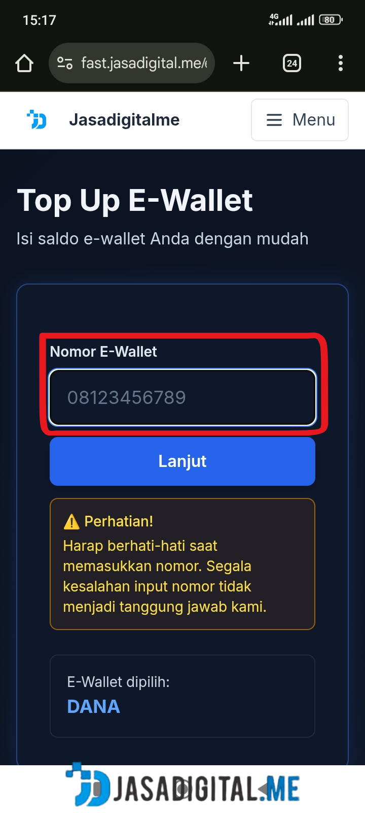 Ketiga, masukkan Nomer DANA Anda. Lalu klik tombol "Lanjut".