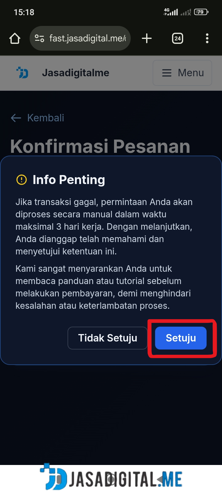 Langkah keempat, pilih dan klik nominal yang Anda Inginkan. Setelah itu, Anda akan melihat tampilan seperti gambar di bawah. Baca "Info Penting" sampai selesai. Jika Anda ingin melanjutkan ke tahap pembayaran, maka klik tombol "Setuju".