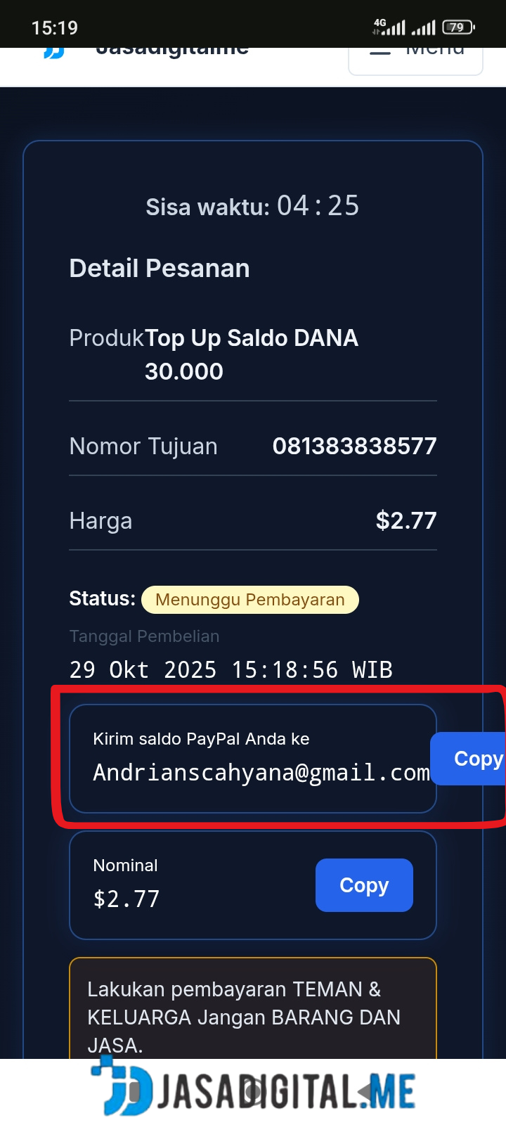 Di halaman tersebut ada detail pesanan Anda, Email PayPal untuk mengirim pembayaran Anda, serta nominal yang harus Anda bayarkan. Salin email yang tersedia dengan cara klik tombol "Copy" untuk melanjutkan pembayaran di aplikasi PayPal.