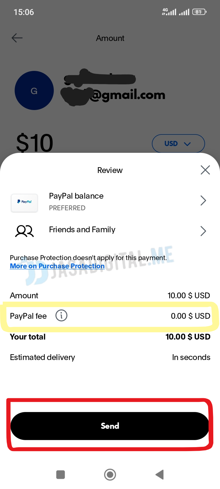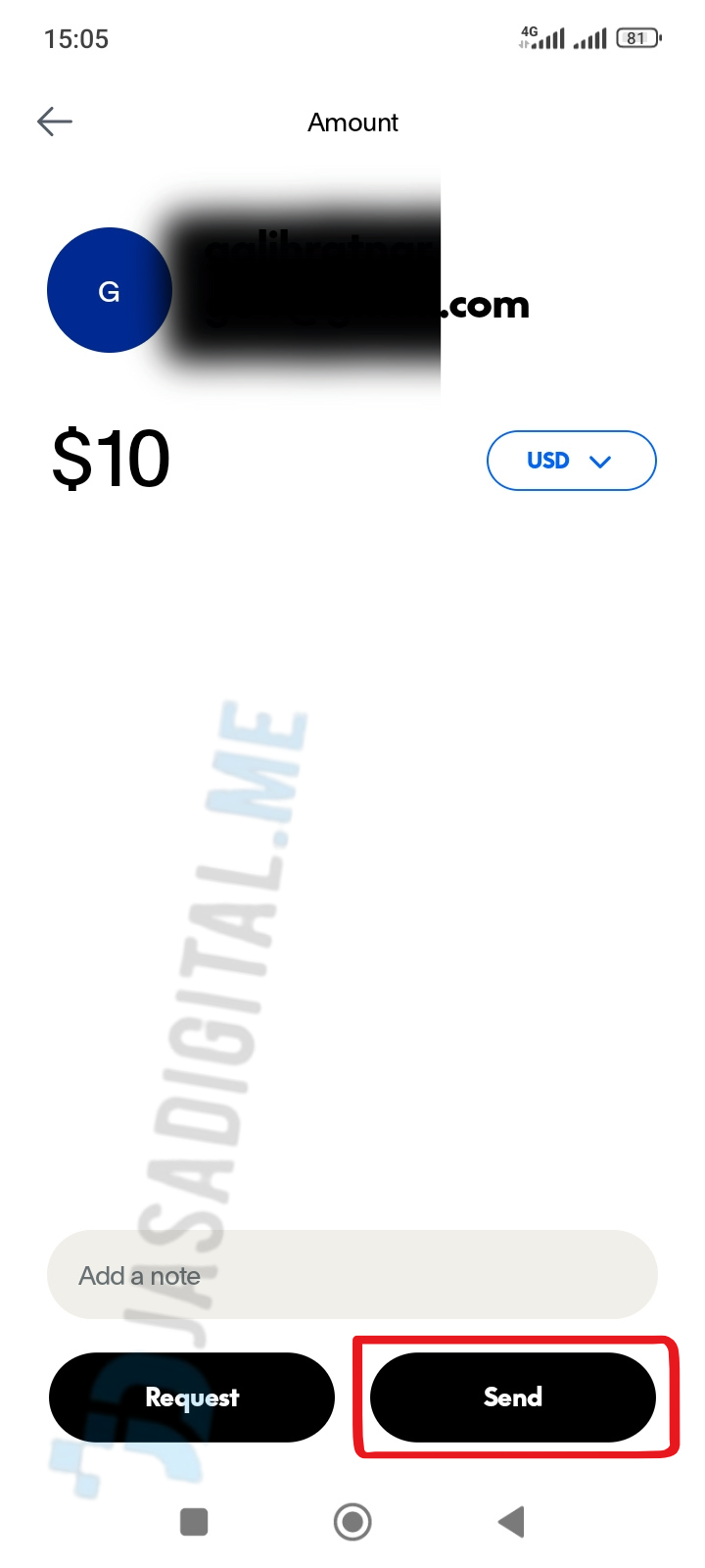 8. Sebelum langkah selanjutnya, periksa kembali email dan jumlah yang dibayar sudah sesuai dengan yang tertera dengan di web fast.jasadigital.me. Lalu, klik tombol "Send" atau "Kirim"