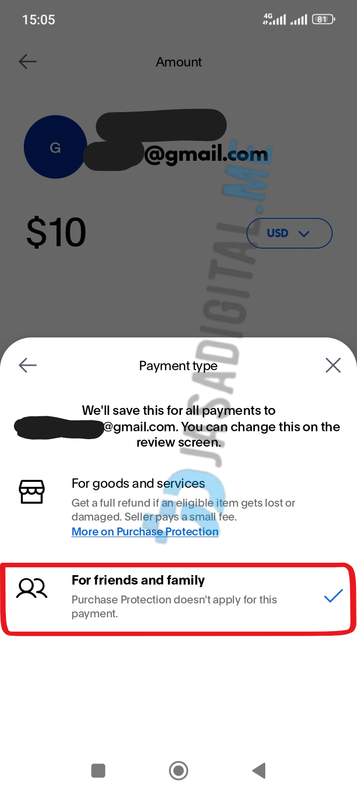7. Selanjutnya Anda akan ditampilkan pilihan "Jenis Pembayaran" seperti gambar di bawah. Ini adalah hal paling penting. Anda WAJIB memilih "For Friends and Family" atau "Untuk Teman dan Keluarga". Contoh seperti gambar di bawah.