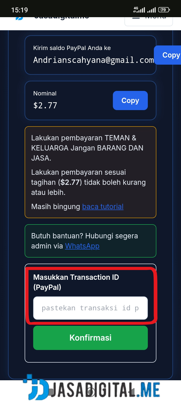 Langkah Terakhir, kembali ke website lalu masukkan ID Transaksi yang sudah disalin ke kolom yang ditandai kotak merah pada gambar di bawah ini. Lalu, klik konfirmasi.